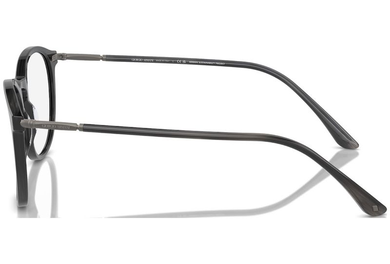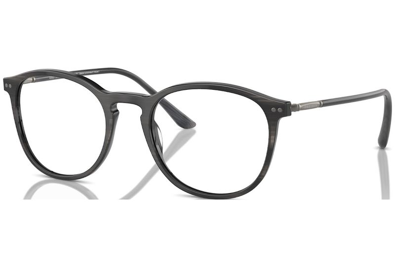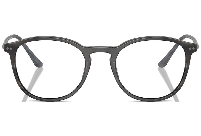 Oculos de grau Giorgio Armani AR7125 tem armacao em acetato cinza listrado e detalhe nas hastes em metal
