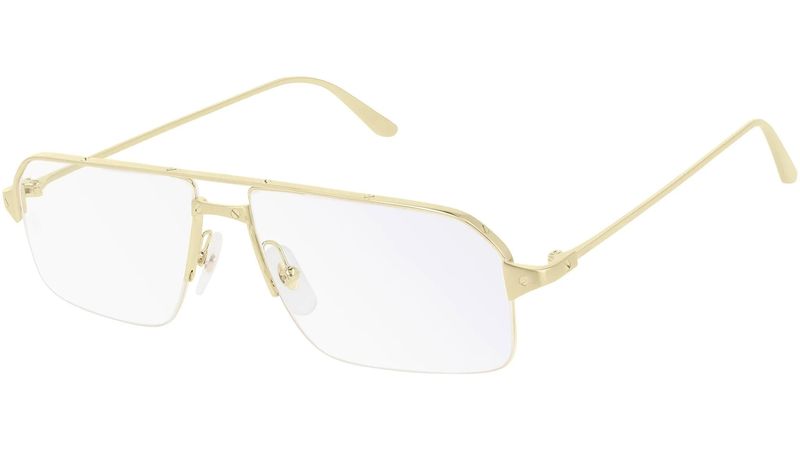 Formato navegador com meio aro para um design com uma estetica marcante e reconhecivel Decoracao com parafusos emblematica, simbolo da colecao Santos de Cartier, na parte superior plana, ponte e hastes como uma parte estetica do elemento Hastes leves e sofisticadas com logotipo Cartier gravado, assinatura com decoracao Duplo C nas plaquetas e acabamento precioso em platina e ouro