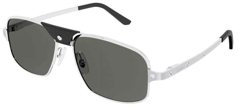 Formato navegador estreito lancado para completar a familia Santos Classico Decoracao com parafusos tipica do Santos e faixa antitranspirante removivel em couro de bezerro Precioso acabamento escovado em contraste com parafusos de acabamento precioso liso Lentes polarizadas em todas as referencias, logotipo Cartier gravado nas hastes e decoracao de parafuso nas pontas das hastes