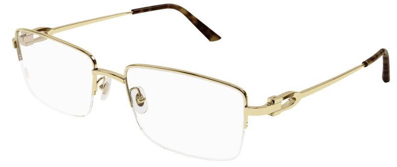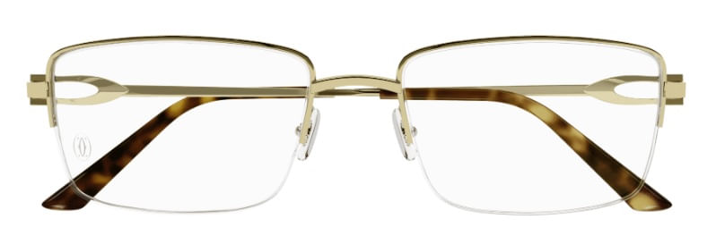 Oculos de grau Cartier CT0319O tem formato retangular masculino em uma estrutura de meio aro Reinterpretacao contemporânea e sofisticada do historico detalhe de decoracao letra C Armacao inteiramente em metal com logotipo Cartier gravado a laser nas pontas das hastes em acetato