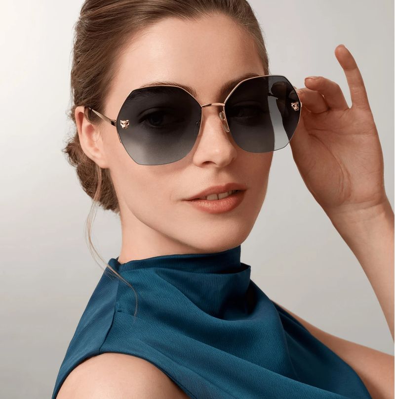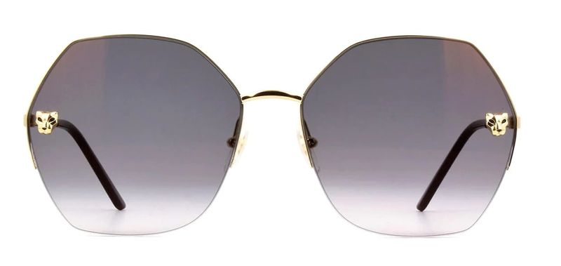 Oculos de sol Panthere de Cartier em metal com acabamento dourado liso, forma redonda e lentes cinzentas degrade com brilho dourado