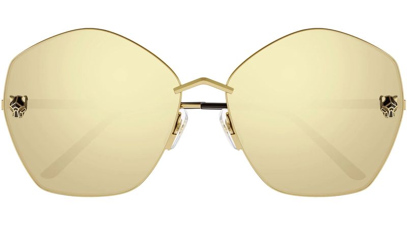 Oculos de sol Panthere de Cartier em metal liso com acabamento dourado, formato oversized e com lentes espelhadas douradas
