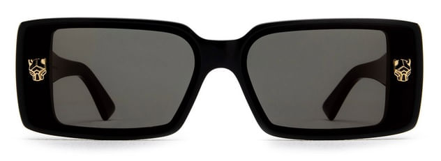 Colecao de oculos de sol Cartier modelo CT0358S 001 com armacao retangular preta e cinza com lente flash dourada