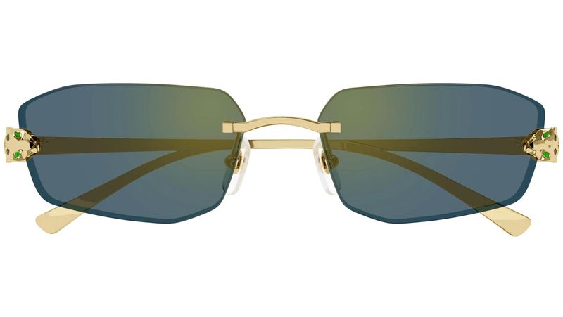 Oculos de sol Cartier modelo CT0474S armacao de metal geometrico dourada e lentes verdes com flash dourado