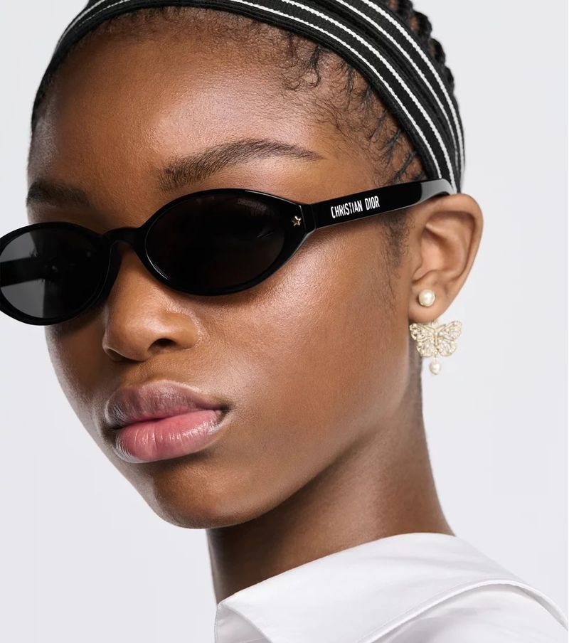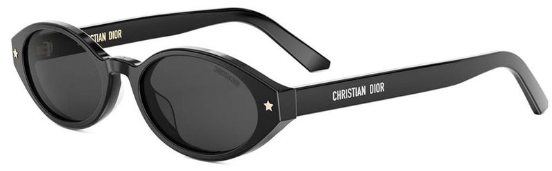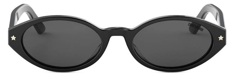 Os oculos escuros DiorPacific R1I valorizam o design com um formato oval baixo moderno A armacao de acetato preto e adornada com detalhes de estrelas com acabamento dourado na frente, enquanto as hastes revelam uma inscricao Christian Dior branca Finalizado com lentes cinza, este modelo essencial agrega um toque elegante a qualquer look