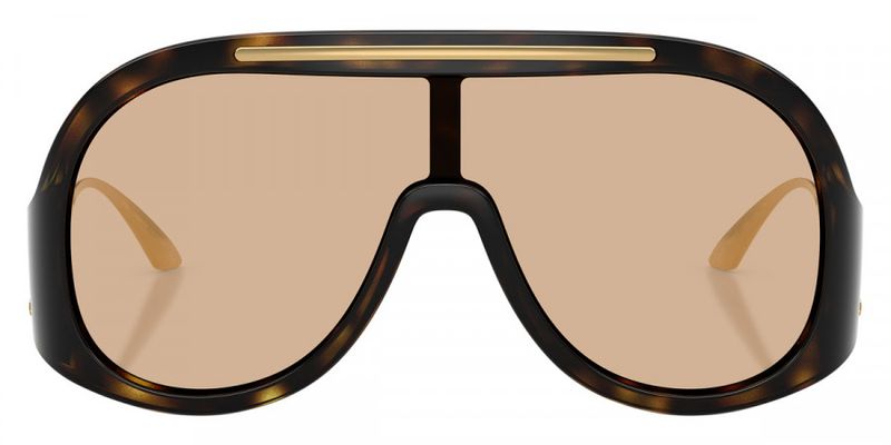 Um escudo impactante com uma parte frontal injetada, realcada por uma insercao de metal na parte superior frontal, e hastes graciosamente curvas que fluem com um charme sinuoso