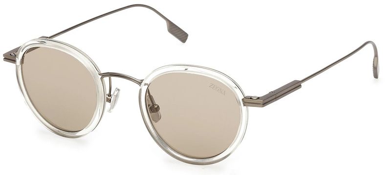 Estes oculos de sol transparentes em tom bege claro oferecem conforto e leveza gracas a uma construcao especial que explora as propriedades nobres do titânio flexivel: uma fina haste metalica envolve o acetato arredondado com linhas suaves e fluidas As plaquetas nasais ajustaveis e as hastes com apoio para os dedos garantem um encaixe seguro, enquanto a nossa iconica marca registrada 232 Road finaliza o visual com a elegância caracteristica da ZEGNA