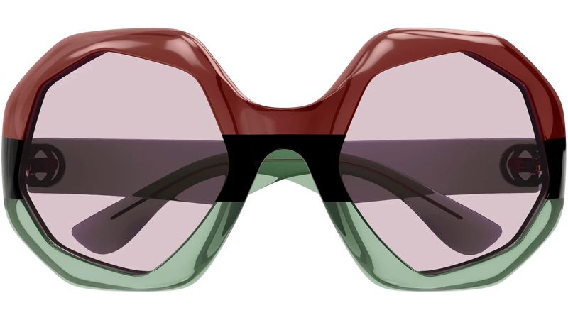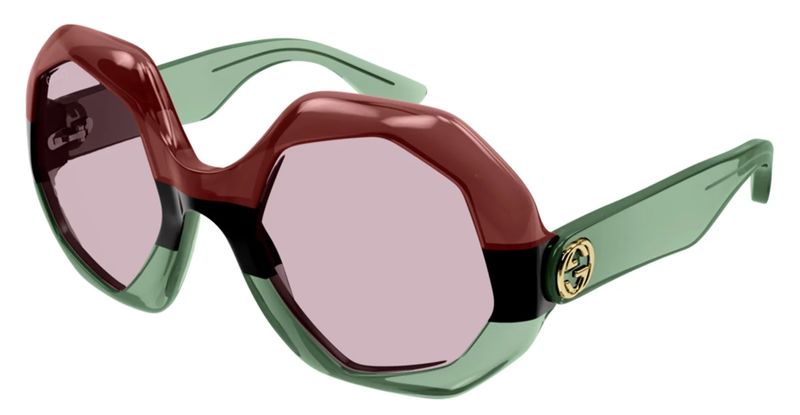 Oculos de sol Gucci GG1242S com armacao vermelha translucida e verde transparente com detalhe Interlocking GG dourado Lentes cor de rosa