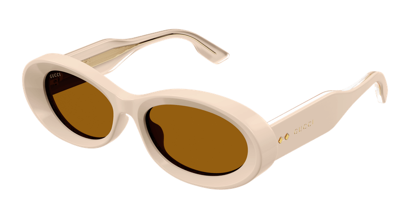 Apresentados em uma combinacao de acetato bege e lentes na cor marrom, estes oculos de sol com armacao oval apresentam uma silhueta simplificada, acentuada por dois pequenos tachas de metal e detalhe do logotipo Gucci esmaltado nas hastes