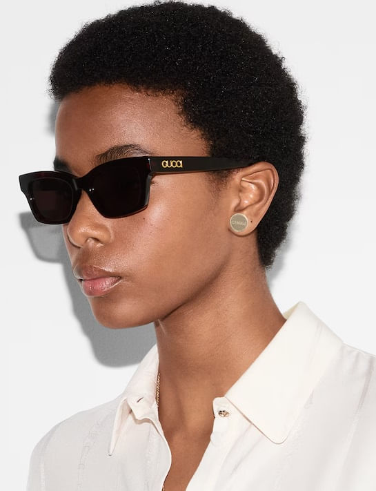 A colecao de oculos Cruise 2025 combina uma silhueta essencial com motivos exclusivos Estes oculos de sol estilo gatinho sao realcados pelo logotipo da Gucci