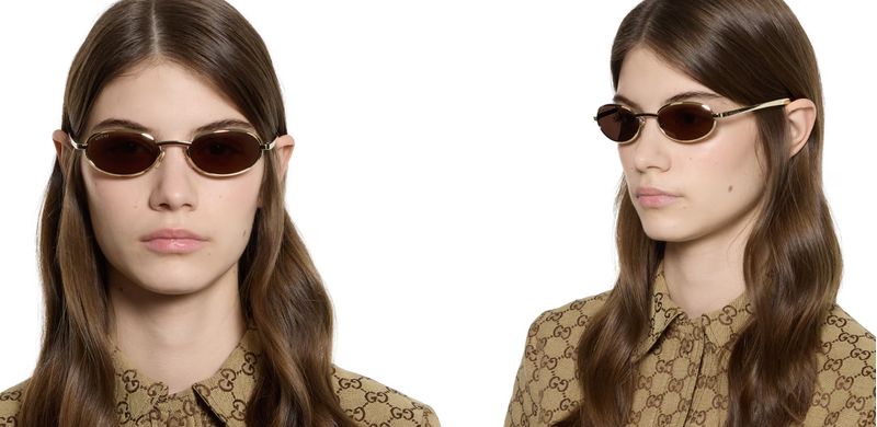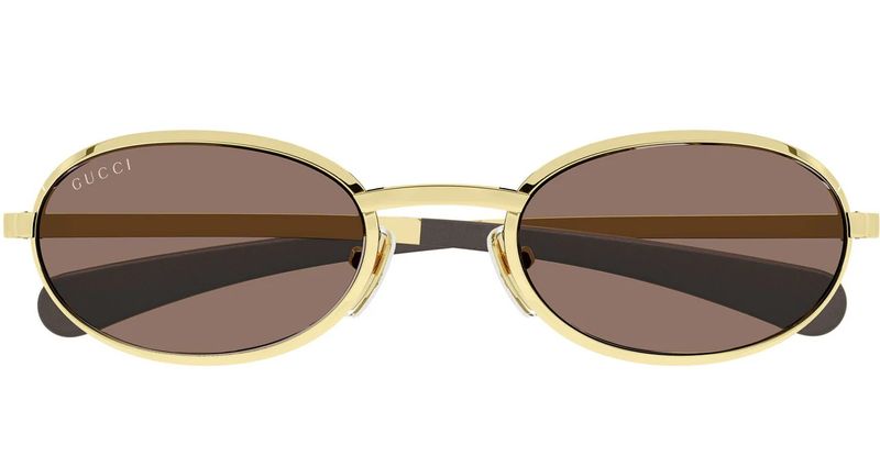 A colecao de oculos Pre-Fall 2025 combina silhuetas iconicas dos arquivos com um toque contemporâneo Estes oculos de sol com armacao oval apresentam lentes marrons solidas e o logotipo da Gucci gravado nas hastes