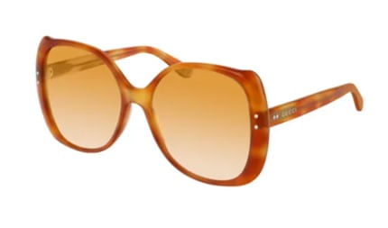 Oculos de sol Gucci GG0472S tem armacao borboleta confeccionada em acetato caramelo As lentes marrom degrade garantem protecao contra os raios UV