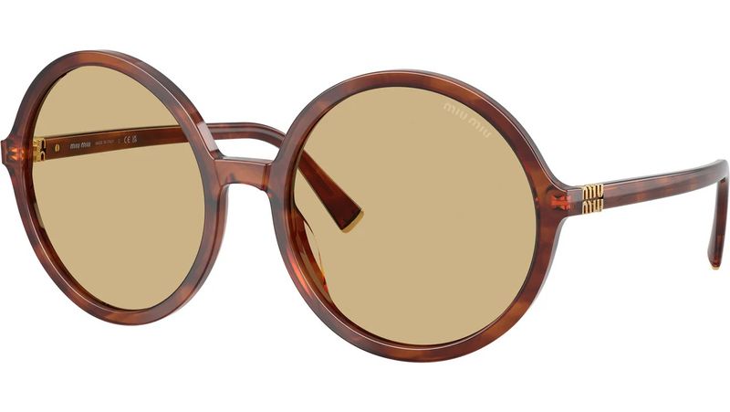 A Miu Miu traz seu caracteristico senso de travessura aos oculos, transformando itens essenciais do dia a dia em pecas marcantes Estes oculos de sol redondos e grandes em acetato tem hastes delicadamente finas e um sutil logotipo metalico da Miu Miu