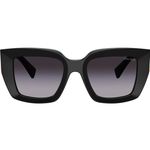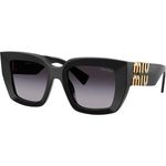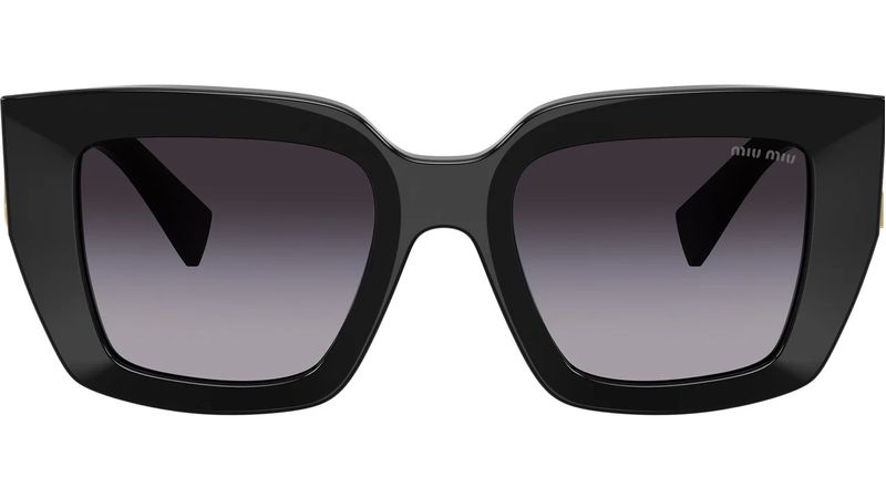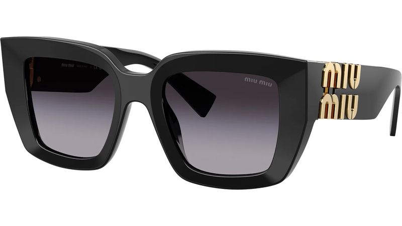 Os oculos de sol Miu Glimpse apresentam um design geometrico e volumes ousados A armacao oversized em acetato exibe perfis marcantes, realcados pelo iconico logotipo vertical da Miu Miu integrado a dobradica das hastes grossas