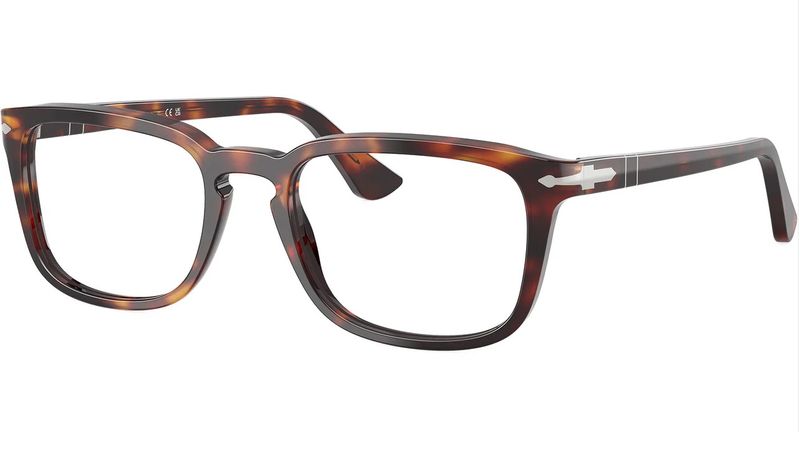Um exemplo de elegância: essas armacoes de grau Persol reinventam a silhueta retangular suave com excepcional delicadeza A ponte em formato de fechadura remete a heranca da marca, enquanto as hastes finas se transformam em icones de identidade com a integracao da Flecha Suprema e do sistema Meflecto