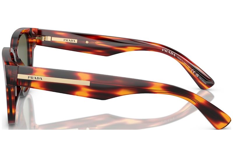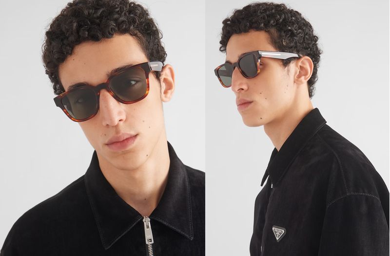 Oculos de sol em acetato com elegância contemporânea A frente com design phantos funde-se com os importantes volumes das hastes enriquecidas pela iconica placa de metal assinada com o logotipo Prada Lettering