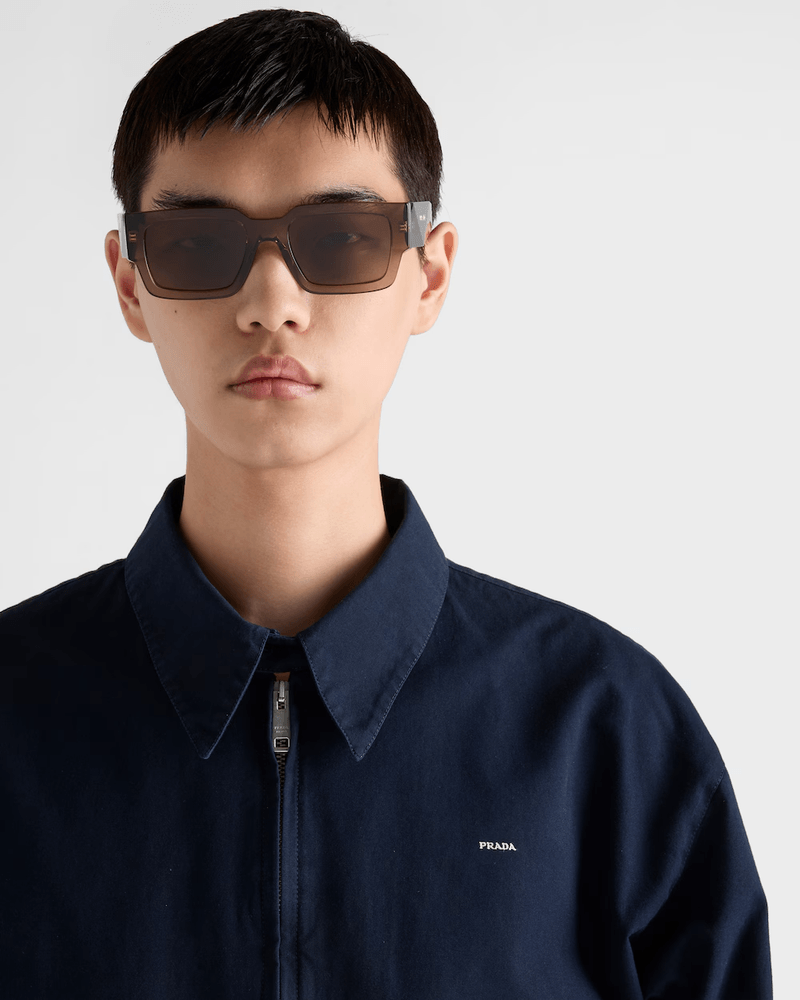Oculos de sol em acetato com design quadrado contemporâneo A grande armacao frontal com perfil arrojado combina com hastes facetadas, realcadas por um design tridimensional exclusivo com a inscricao do logotipo da Prada Algumas cores apresentam uma combinacao de lentes de acetato, destacadas por cores contrastantes nos perfis das lentes