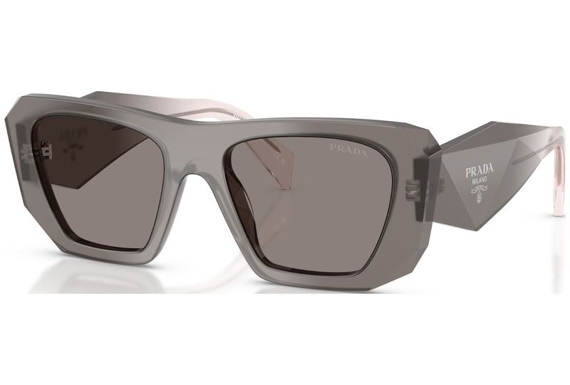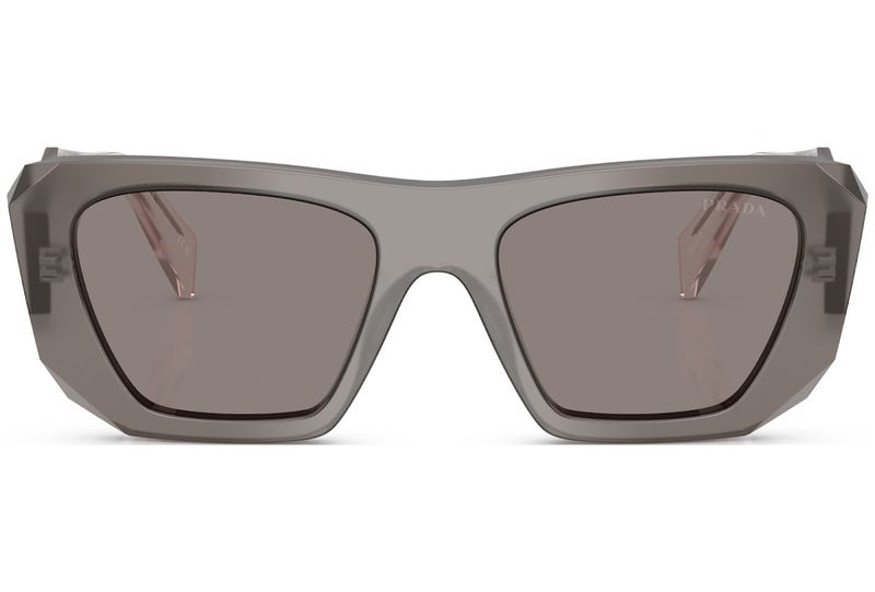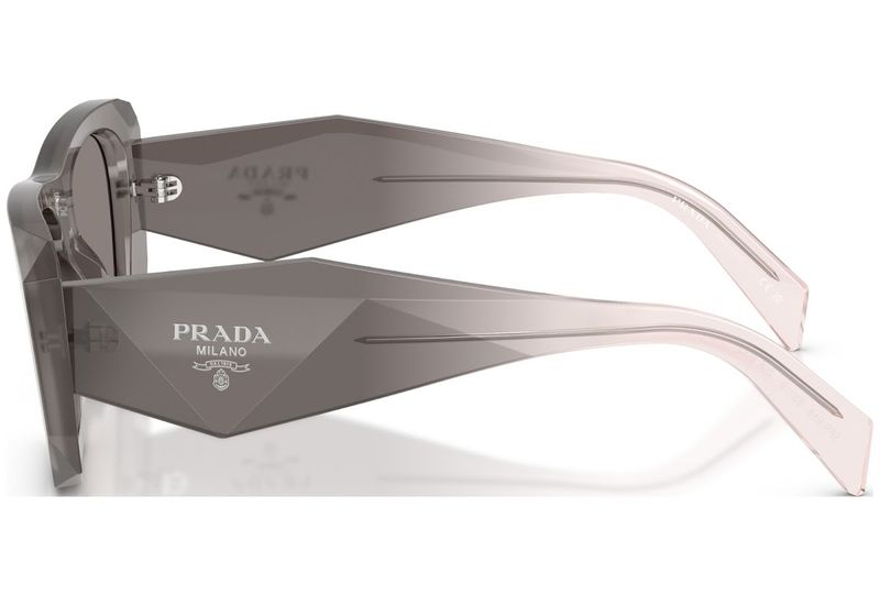 Um design oversized e volumes ousados definem estes oculos de sol em acetato A armacao e caracterizada por uma parte frontal geometrica e perfis bem definidos nas bordas externas O acabamento tridimensional das hastes e marcado por uma interpretacao iconografica do tradicional logotipo triangular da Prada