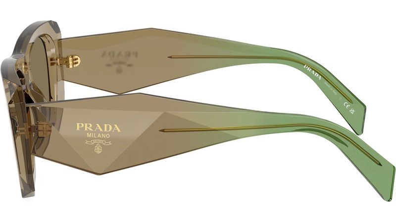 Um design oversized e volumes ousados definem estes oculos de sol em acetato A armacao e caracterizada por uma parte frontal geometrica e perfis bem definidos nas bordas externas O acabamento tridimensional das hastes e marcado por uma interpretacao iconografica do tradicional logotipo triangular da Prada