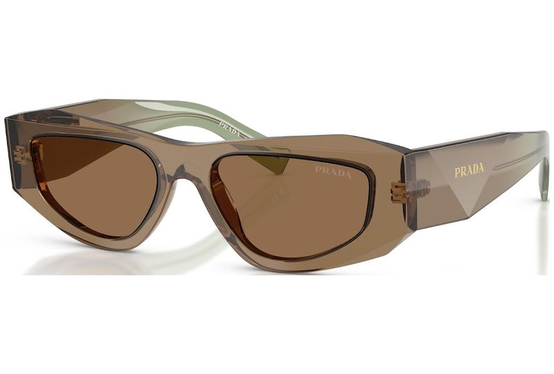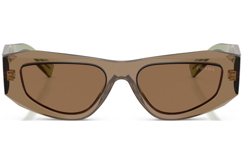 Oculos de sol em acetato com estetica contemporânea A parte frontal retangular geometrica apresenta volumes generosos, enquanto as hastes facetadas apresentam detalhes tridimensionais e o logotipo da Prada