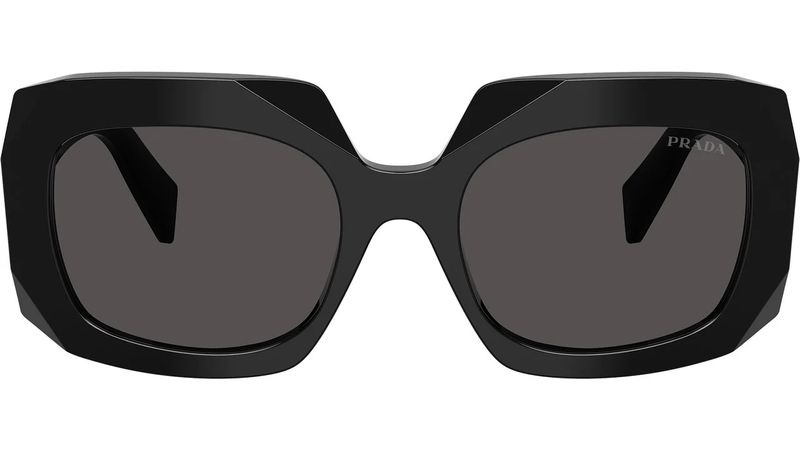 Oculos de sol em acetato com design geometrico e volumes ousados A armacao ousada destaca a frente quadrada e ampla, definida pelo corte limpo e inclinado nas bordas externas O trabalho tridimensional das hastes e marcado por uma interpretacao iconografica do tradicional logotipo triangular da Prada