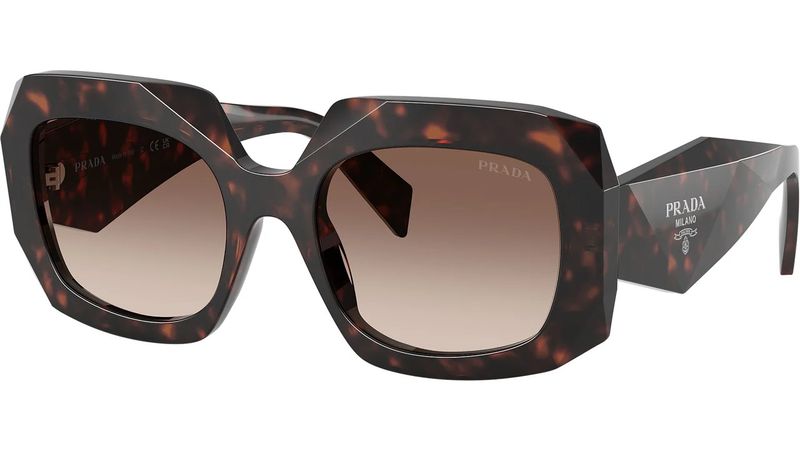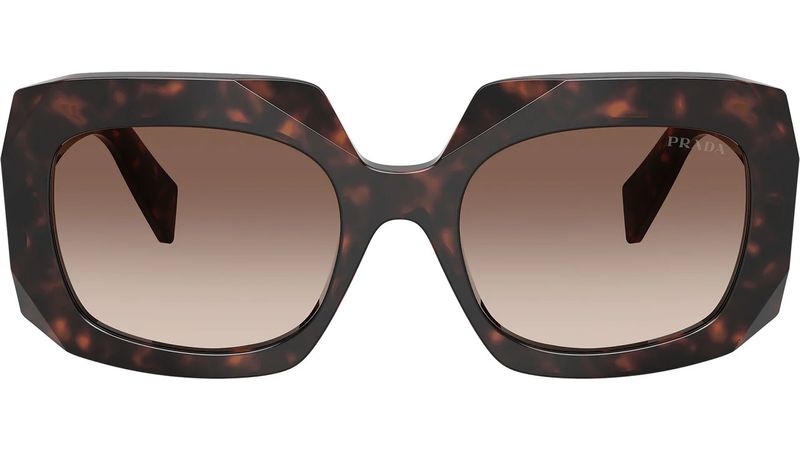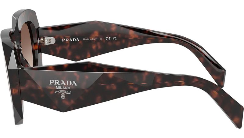 Oculos de sol em acetato com design geometrico e volumes ousados A armacao ousada destaca a frente quadrada e ampla, definida pelo corte limpo e inclinado nas bordas externas O trabalho tridimensional das hastes e marcado por uma interpretacao iconografica do tradicional logotipo triangular da Prada