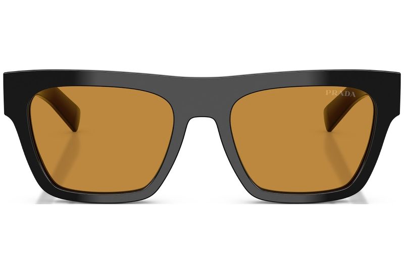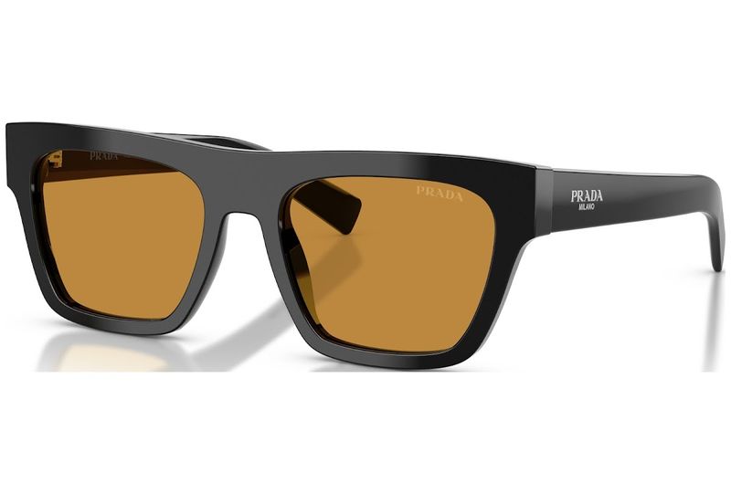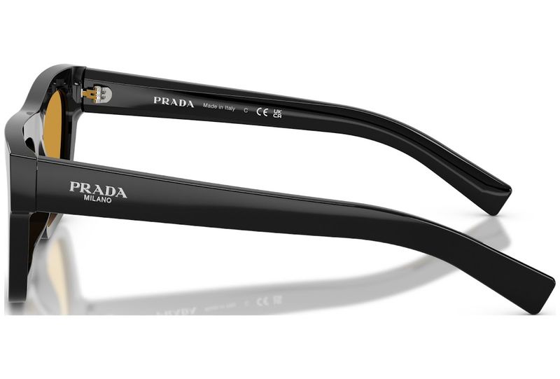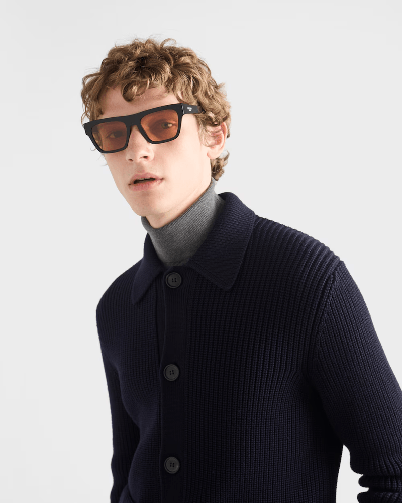 Oculos de sol em acetato com elegância atemporal A armacao frontal ampla e quadrada apresenta linhas marcantes, enquanto as hastes minimalistas sao adornadas com o logotipo da Prada Milano