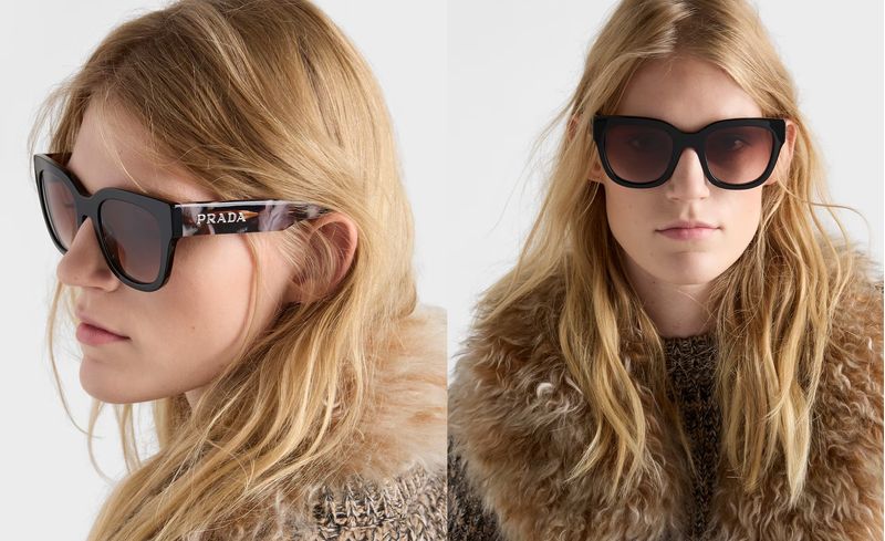 Oculos de sol em acetato com design oversized e levemente gatinho A armacao frontal ampla e geometrica e combinada com hastes altas que exibem o logotipo da Prada