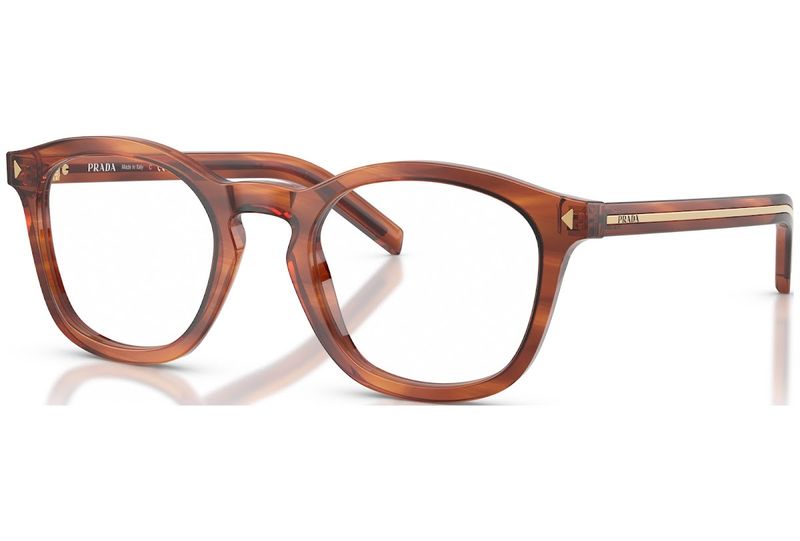 Inspirados na elegância discreta que e marca registrada da Prada, estes oculos de grau combinam detalhes classicos com uma silhueta moderna A armacao em acetato no formato panthos apresenta pinos triangulares na parte frontal e uma ponte em formato de fechadura, enquanto a placa metalica alongada nas hastes confere uma assinatura sutil, porem inconfundivel
