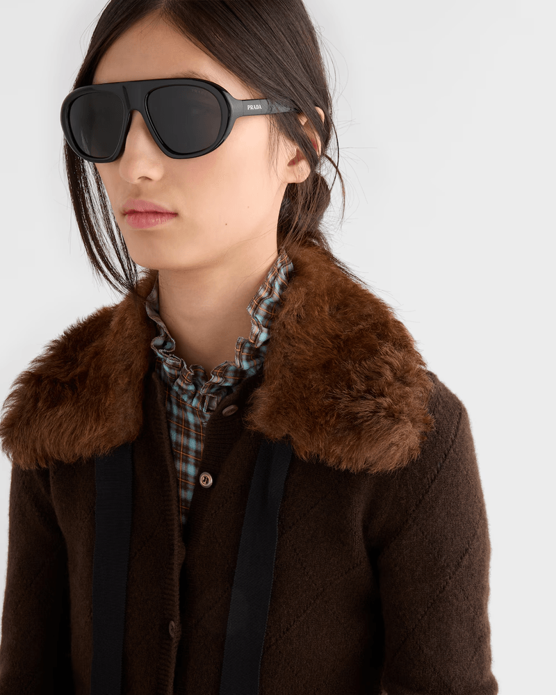 Oculos de sol oversized em acetato A armacao apresenta um formato aviador grande e volumes marcantes que conferem um visual contemporâneo e feminino As hastes arredondadas sao adornadas com o logotipo da Prada em esmalte