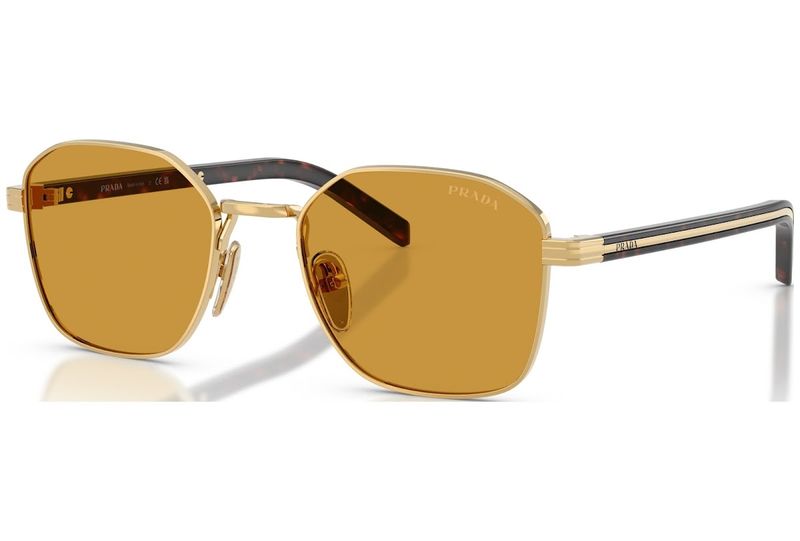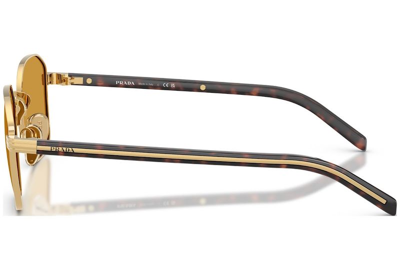 Oculos de sol metalicos com um toque casual A armacao retangular apresenta lentes hexagonais e hastes finas adornadas com a iconica placa de metal com o logotipo Prada Lettering