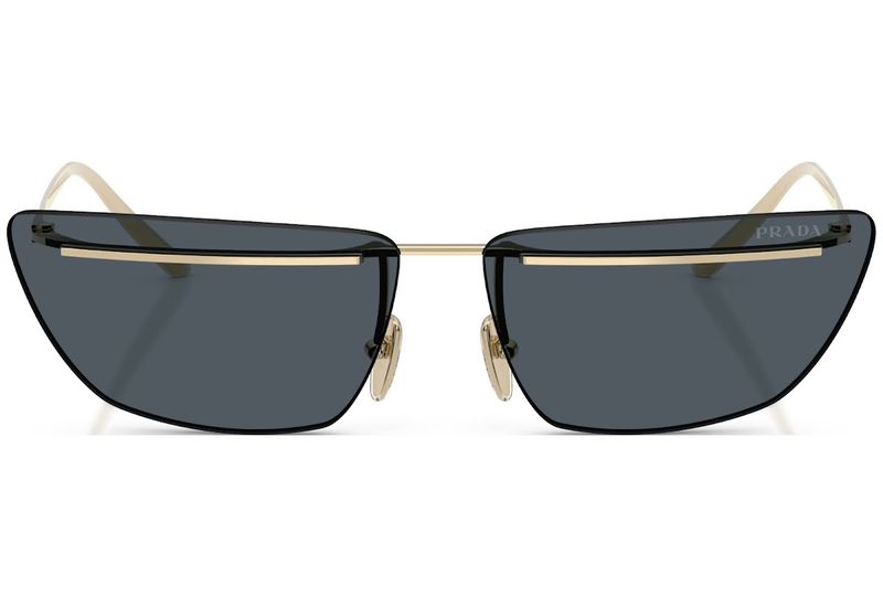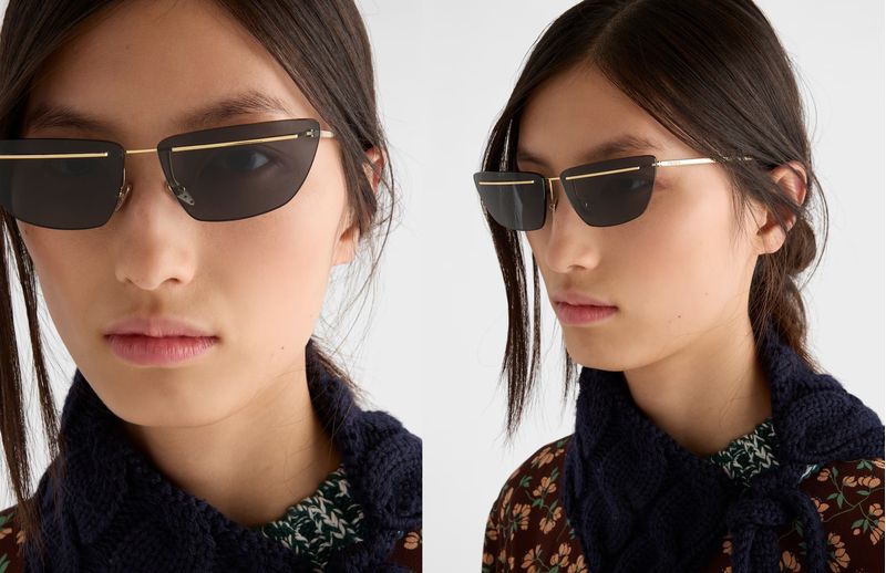 Oculos de sol em metal com uma silhueta ultraleve As lentes sem aro integradas a armacao em metal criam uma estetica clean e sofisticada O logotipo de letras Prada e delicadamente gravado nas hastes