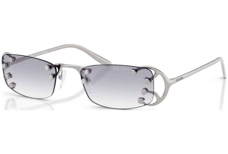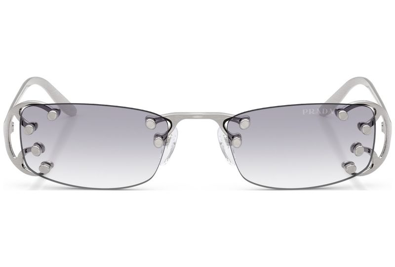 Um design sofisticado e original caracteriza os novos oculos de sol da colecao OutonoInverno 2025 A armacao apresenta lentes independentes com formato quadrado, acentuadas por detalhes metalicos exclusivos inspirados em elementos tipicos do estilo Art Nouveau As hastes lineares exibem a inscricao com o logotipo da Prada