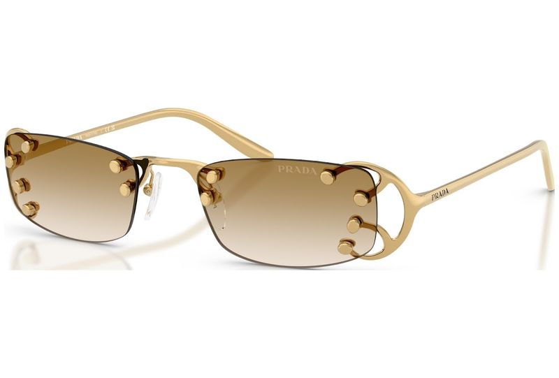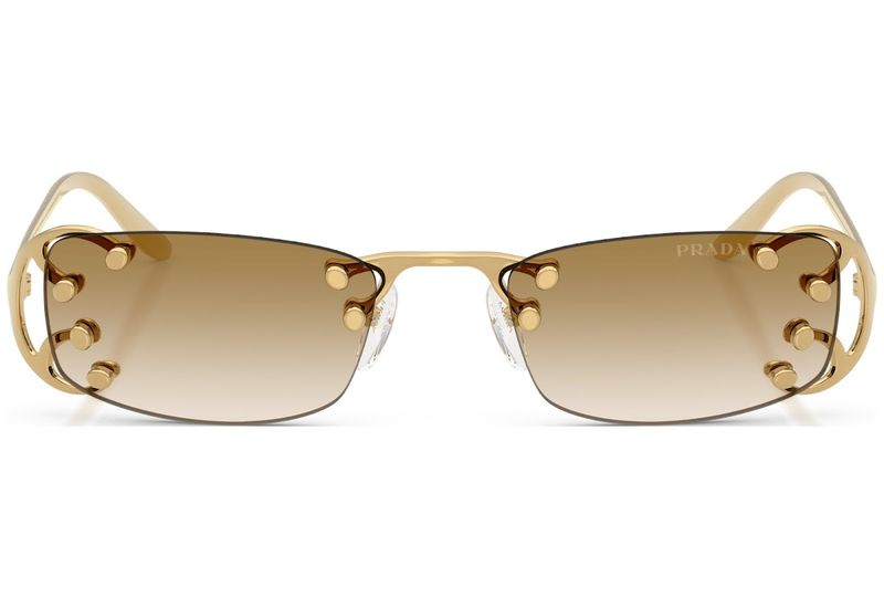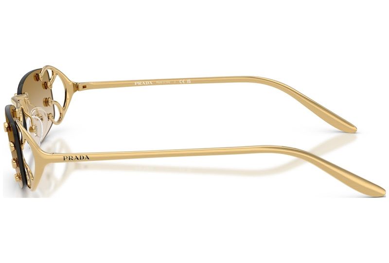 Um design sofisticado e original caracteriza os novos oculos de sol da colecao OutonoInverno 2025 A armacao apresenta lentes independentes com formato quadrado, acentuadas por detalhes metalicos exclusivos inspirados em elementos tipicos do estilo Art Nouveau As hastes lineares exibem a inscricao com o logotipo da Prada