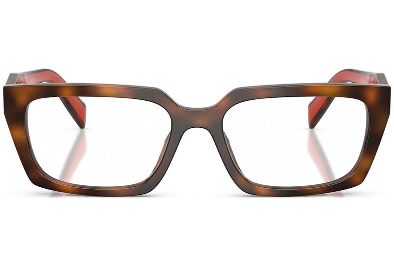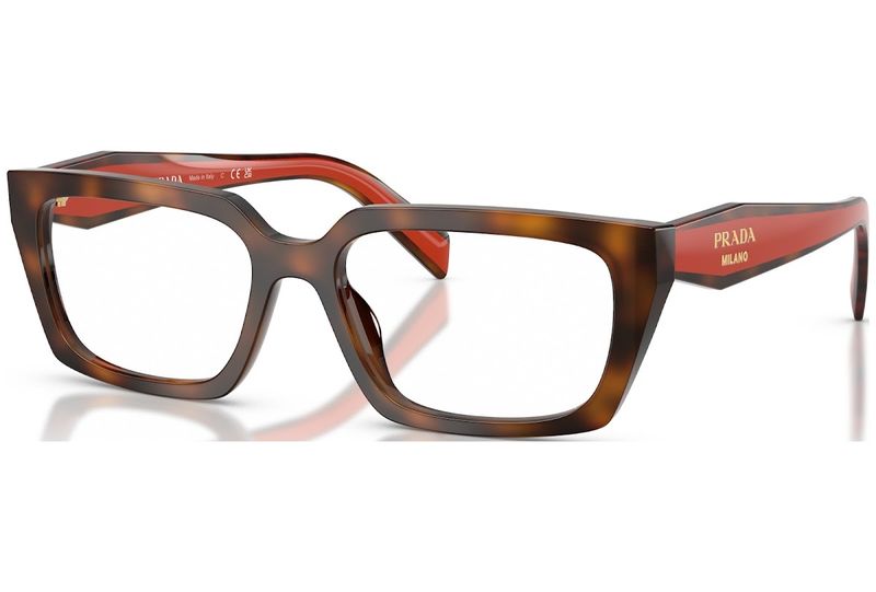 A essencia do requinte moderno da Prada capturada em uma silhueta retangular atemporal Este modelo de oculos de grau apresenta hastes bicolores distintas, confeccionadas em acetato leve e adornadas com o iconico logotipo da Prada Milano em acabamento dourado