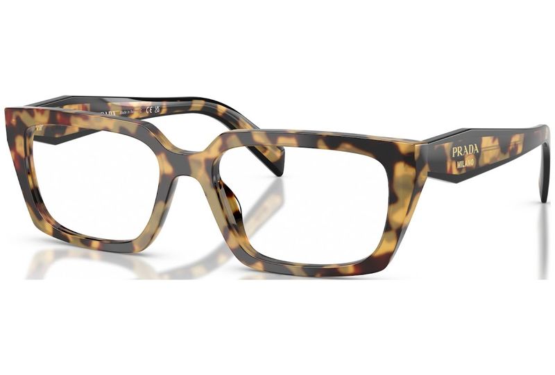 A essencia do requinte moderno da Prada capturada em uma silhueta retangular atemporal Este modelo de oculos de grau apresenta hastes bicolores distintas, confeccionadas em acetato leve e adornadas com o iconico logotipo da Prada Milano em acabamento dourado