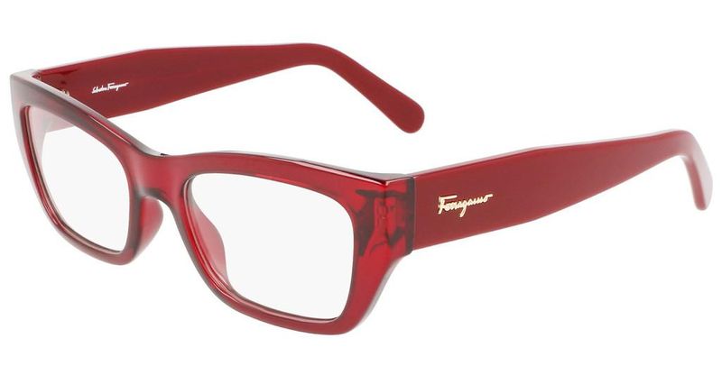 Oculos de grau Salvatore Ferragamo SF2922 tem armacao retangular em acetato vermelho translucido