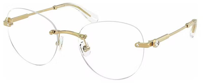 Com lentes sem aro e uma construcao metalica elegante, sao os cristais octogonais exclusivos em transparente, rosa claro, sombra dourada ou peridoto que levam os holofotes nesses oculos opticos Os delicados cristais sao graciosamente colocados nas hastes, adicionando um toque de brilho refinado ao design minimalista