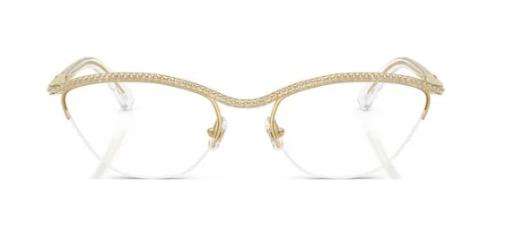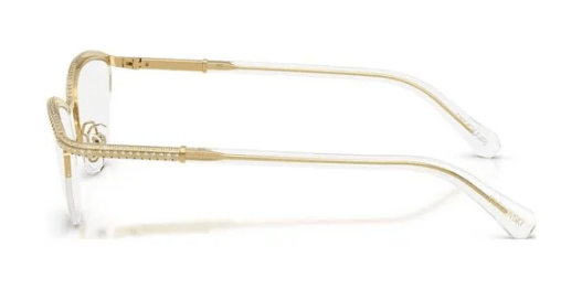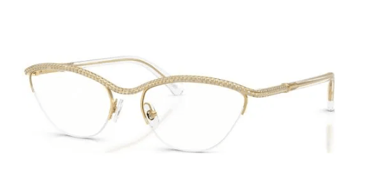 Este design optico sem aro exala elegância refinada, apresentando uma armacao de metal elegante e arredondada com uma configuracao pave vibrante que brilha na barra da sobrancelha e nas temporas