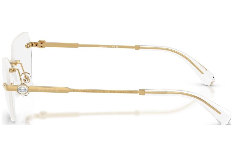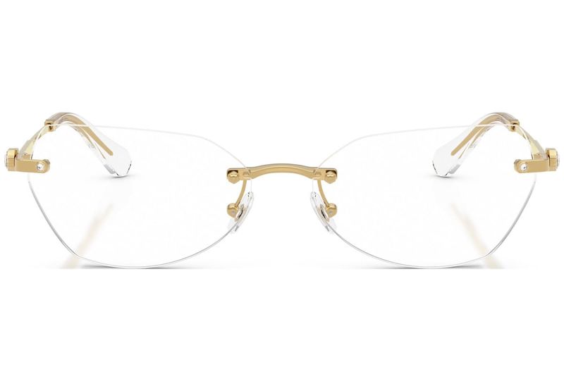 Com lentes sem aro e uma construcao metalica elegante, sao os cristais octogonais exclusivos em transparente, rosa claro, sombra dourada ou peridoto que levam os holofotes nesses oculos opticos Os delicados cristais sao graciosamente colocados nas hastes, adicionando um toque de brilho refinado ao design minimalista