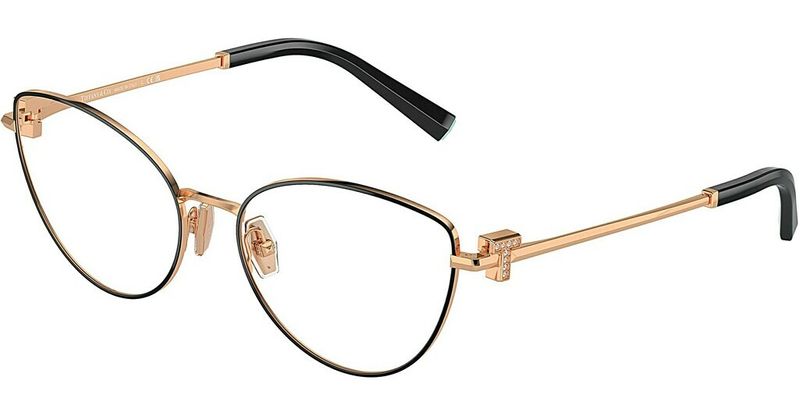 O iconico simbolo T da Tiffany ocupa o centro do palco nesses oculos opticos, elegantemente integrado a construcao da haste com articulacao funcional e adornado com cristais radiantes A elegante armacao de metal e o formato de olho de gato criam um visual ousado e sofisticado