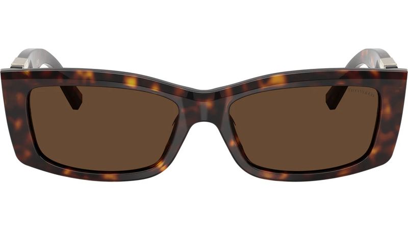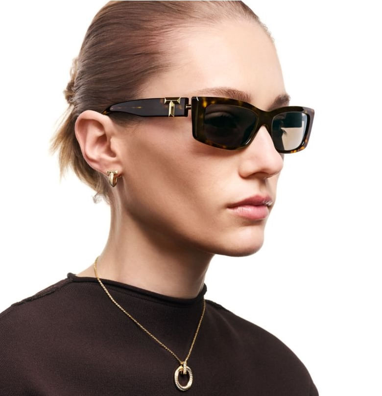 O iconico codigo da Maison Tiffany esta de volta Os oculos de sol Tiffany T apresentam um design marcante das hastes inspirado na nossa letra favorita Estes oculos de sol sao confeccionados em acetato tartaruga com detalhes em metal dourado-claro e lentes retangulares em degrade marrom Aposte neste elegante par de oculos de sol