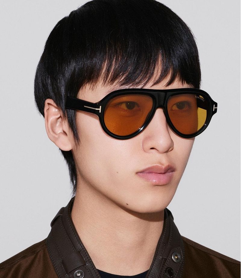 A NOVA COLECAO TOM FORD ICON, PROJETADA COM PRECISAO E APRIMORADA COM ELEGÂNCIA Armacao iconica de piloto que brinca com volumes robustos e bordas arredondadas Um nucleo metalico original na cor dourada enriquece a superficie interna das hastes