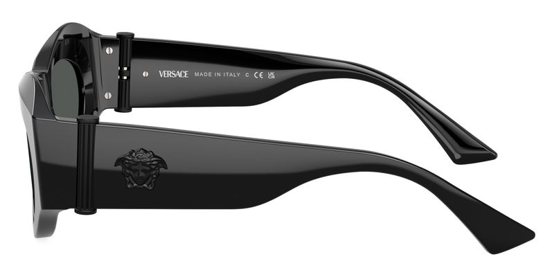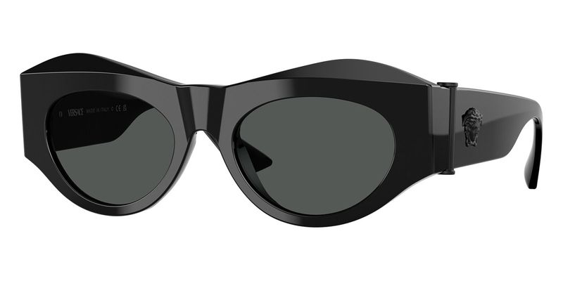 Apresentando um formato oval com linhas precisas e irregulares, estes oculos de sol tem uma construcao totalmente em acetato e sao detalhados com tachas Medusa douradas e detalhes em coluna nas temporas